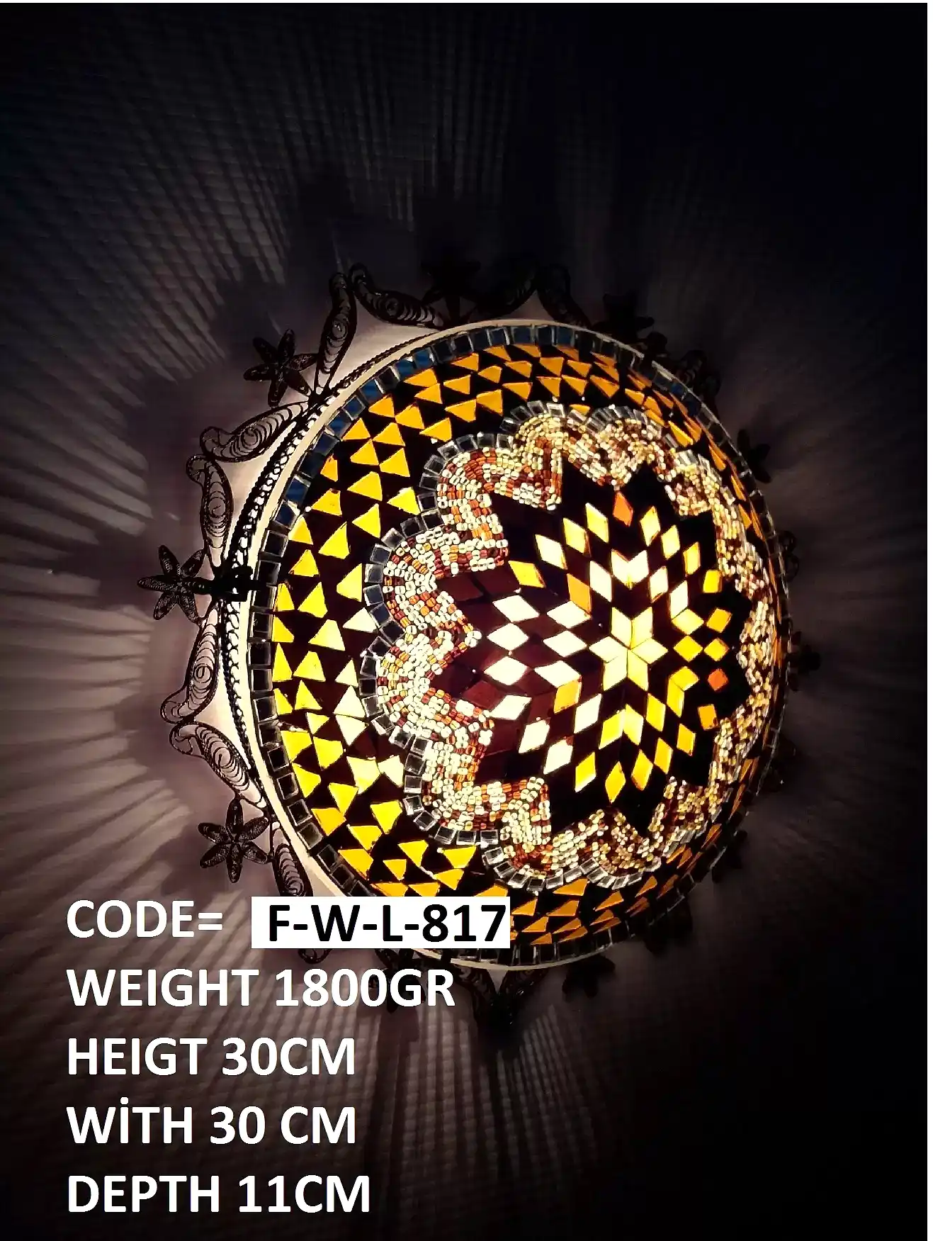 Bakır Telkari Duvar Plafonyeri 40cm Mozaik F-W-L-817 .Ürünün aparatı metal sıvamadan oluşmaktadır. Aparatına ekstra vernik atılarak ,daha uzun ömürlü ve daha parlak olmaktadır. Ürünler yollanmadan tek tek denenmektedir. Kullanılan kablolar kaliteli Ce sertifikalıdır. Ürün üzerinde Ce sertifikalı duy bulunmaktadır. Ürün tamamen Türk malıdır.