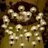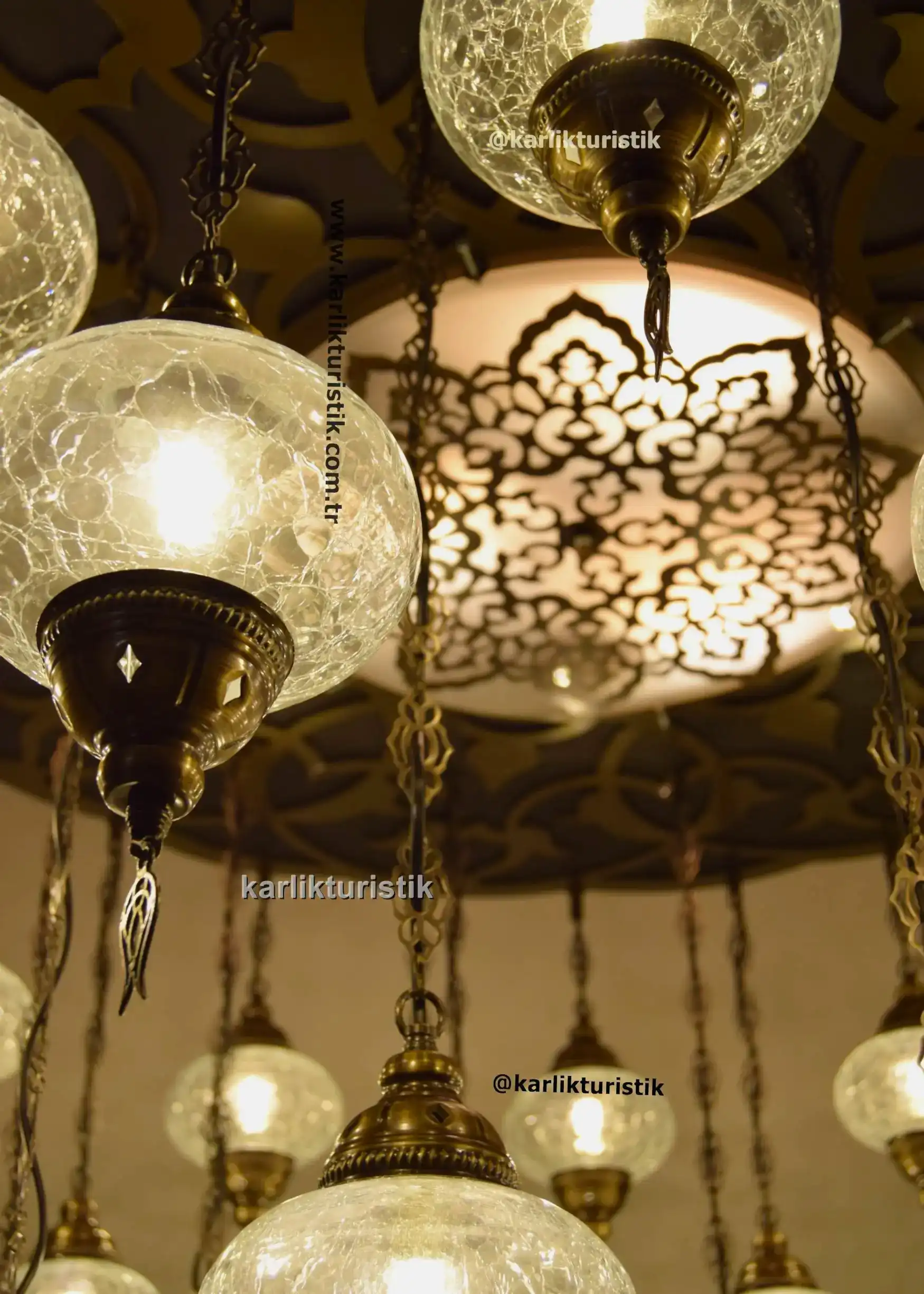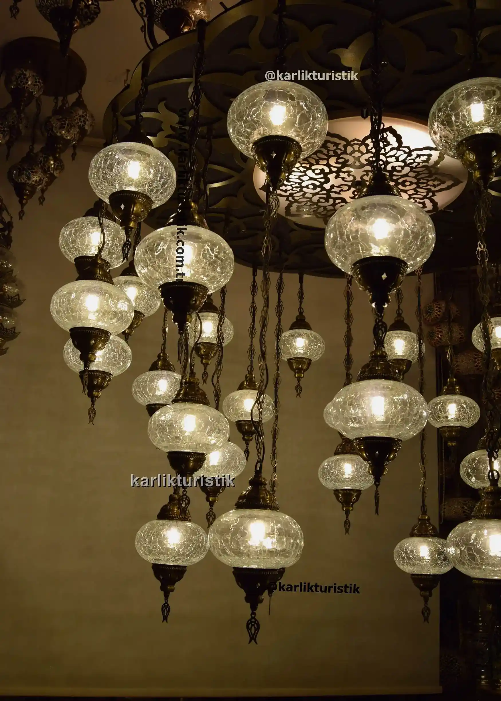 Mekanınıza kristal berraklığında bir zarafet katmak için tasarlanan bu özel avize, modern estetiği geleneksel ustalıkla buluşturuyor. 34 adet şeffaf çatlak desenli (crackle) cam küresi ve devasa merkezi kubbesiyle bu eser, ışığı binlerce parçaya bölerek her köşeye büyüleyici bir ışıltı yayar.