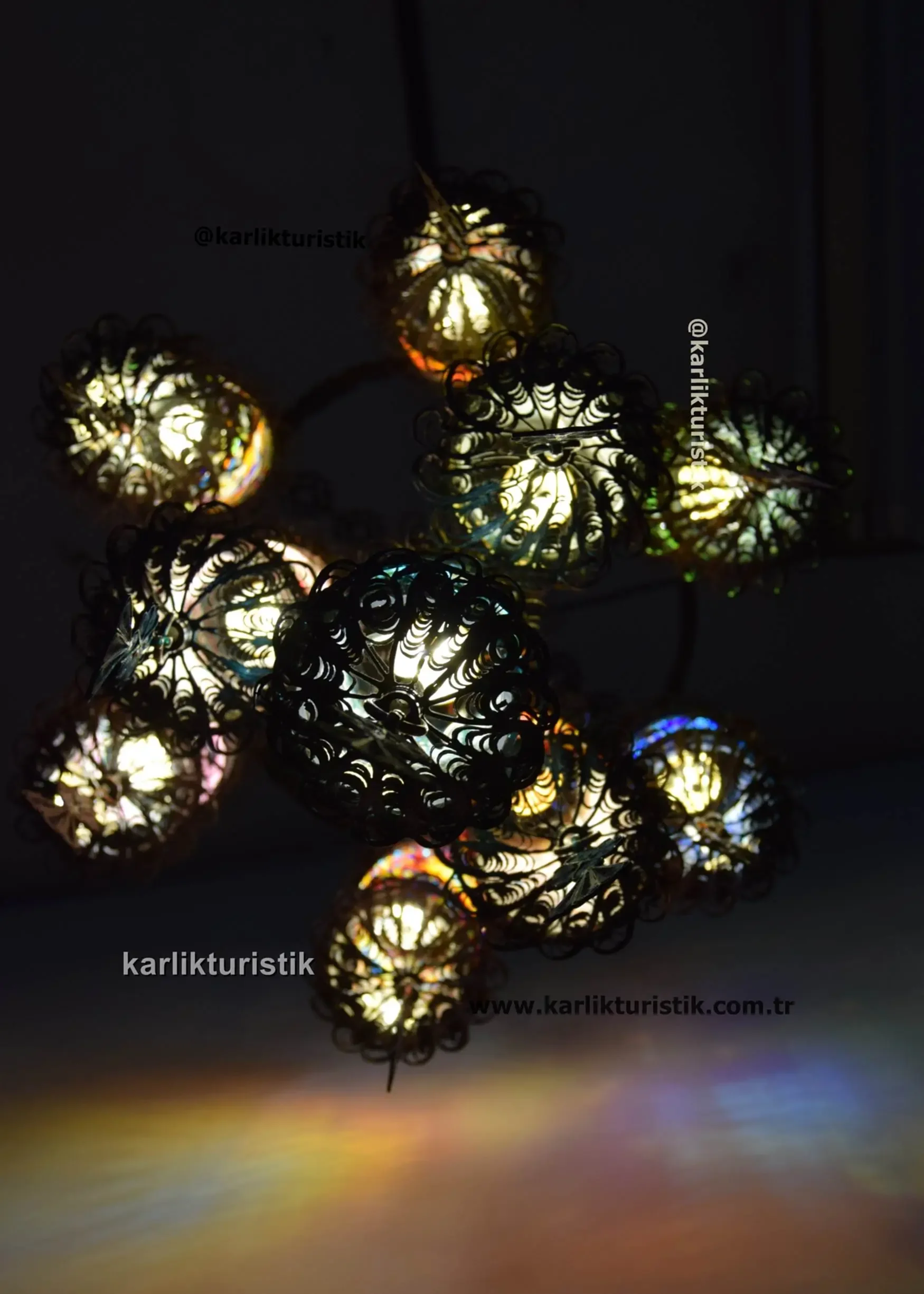 Bu muhteşem avize, her biri ustalarımız tarafından tek tek elde hazırlanan 10 adet silindir mozaik camdan oluşmaktadır. Gövdesi %100 saf bakırdır ve geleneksel Telkari sanatı ile şekillendirilmiştir. İnce metal tellerin el işçiliğiyle örülmesiyle oluşturulan bu teknik, ürüne hem nostaljik hem de lüks bir görünüm kazandırır.