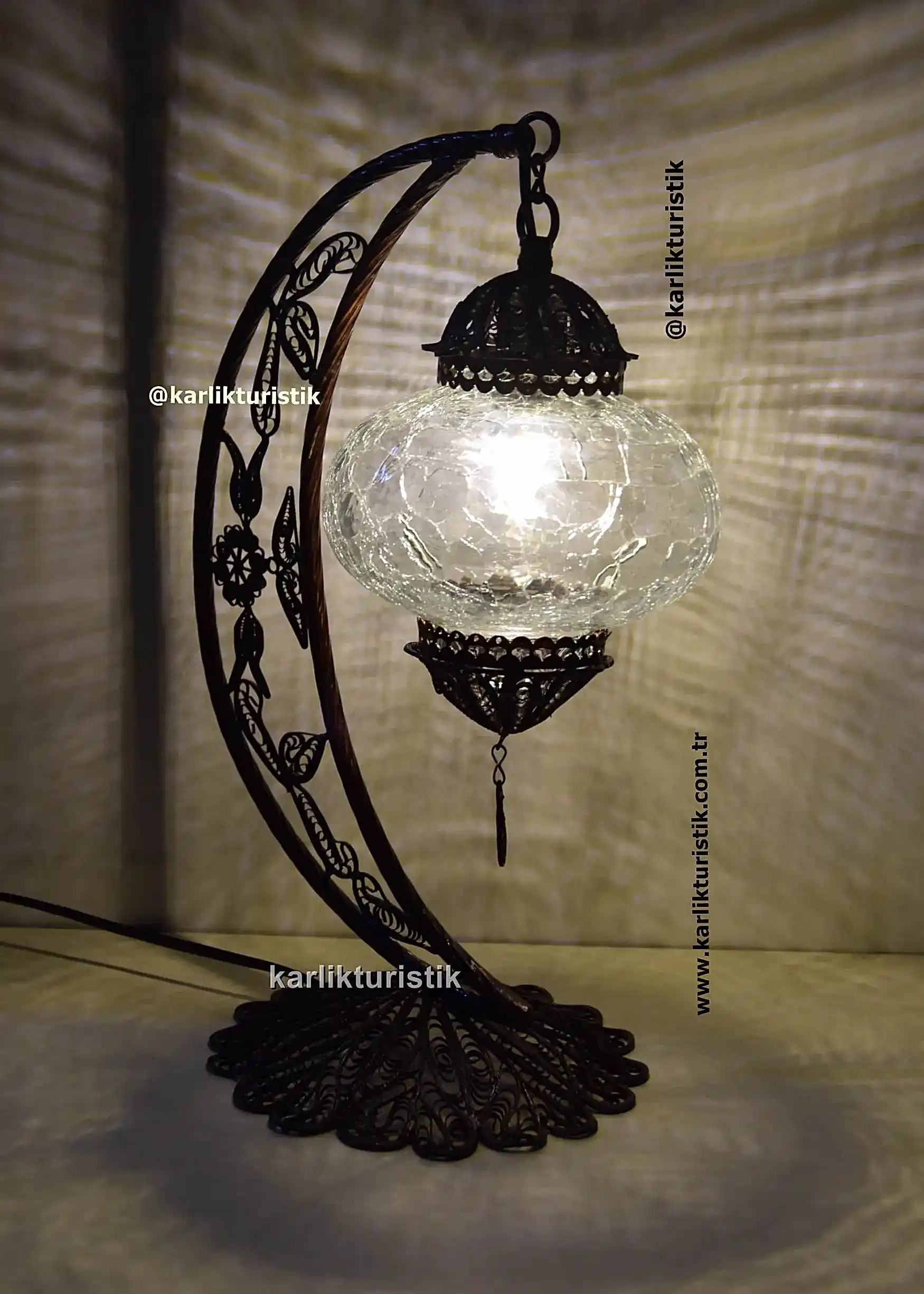 Mekânınıza zarafet ve sıcaklık katın! Bu özel tasarım **hilal şeklindeki masa lambası**, geleneksel **el işçiliği filografi sanatı** ve **bakır malzeme** ile üretilmiştir.