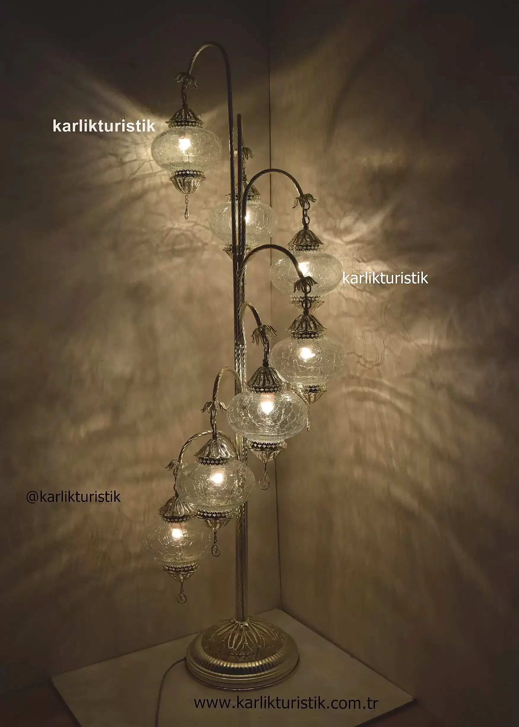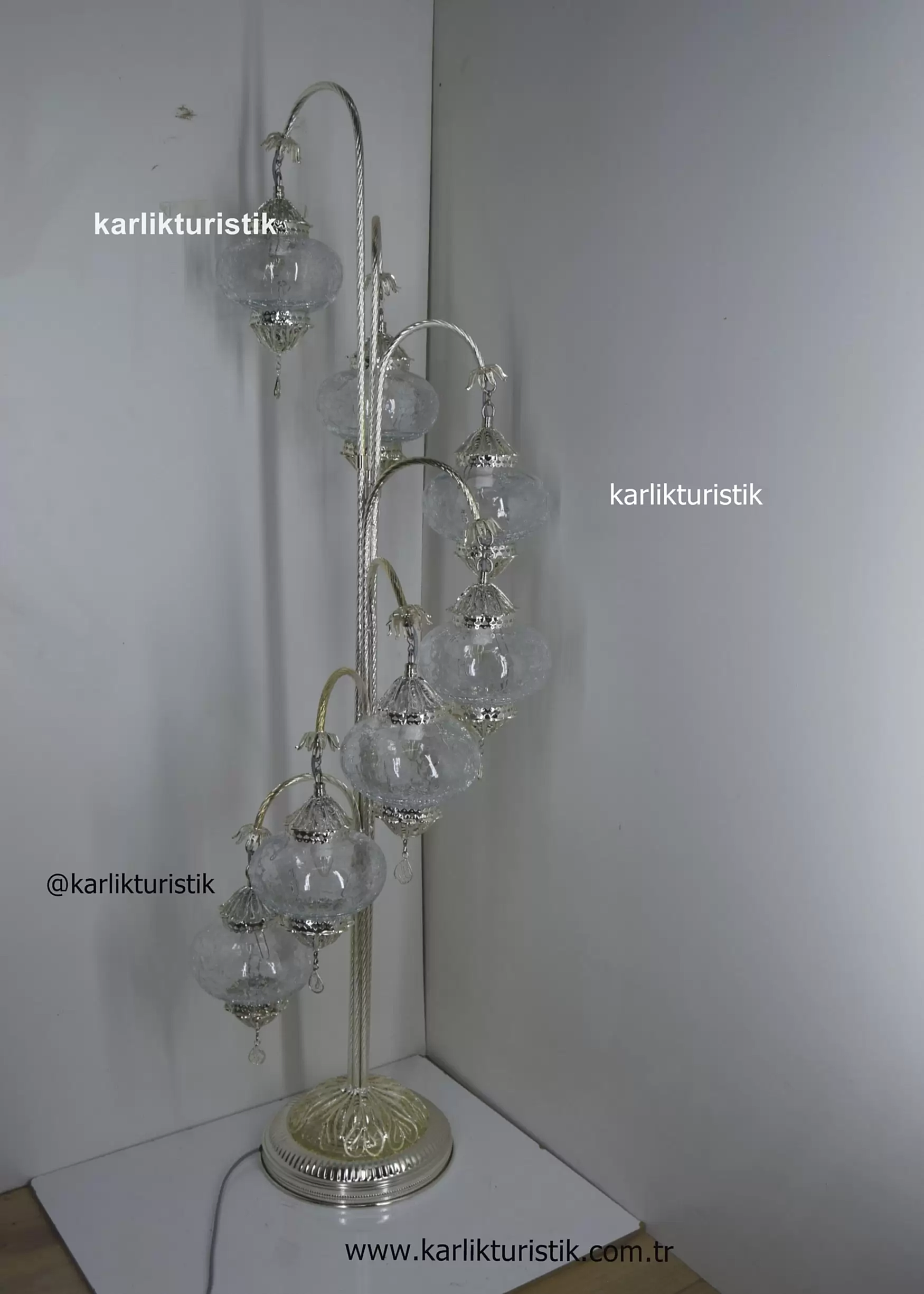 Lambader Şeffaf Cam Çatlatma Desen, Otantik Ayaklı Lamba 7 camlı, Osmanlı Tarzı Lambader Gümüş Kaplama Özel Seri Telkari