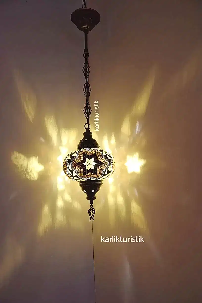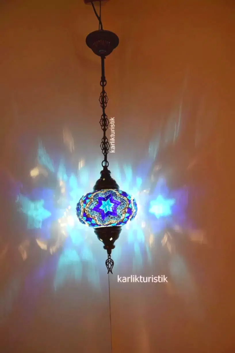 ~Mozaik Camlı Sıvama Tekli Sarkıt Lamba -I-S-H 5202 .Ürünün apratı metal sıvamadan oluşmaktadır.Aparatına extra vernik atılarak ,daha uzun ömürlü ve daha parlak olmakdadır. Ürünler yollanmadan tektek denenmektedir. Kullanılan kablolar kaliteli Ce sertifikalıdır. Ürün üzerinde Ce sertikalı duy bulunmaktadır. Ürün tamamen türk malıdır. Ürün genişliği 16cm olup.Yüksekliği 70 cmdir.İsterseniz ürünü zincir kısmından kısaltıp da kullanabilirsiniz.Güvenle kullanabileceğiniz bir üründür. Ürünün cam kısmı orijinal camdır.Bu üründe kullanılan camın çapı 13cm dir.Camlar solma yapmaz. Camlar geleneksel olan alçı kullanılarak yaplmıştır. Alçı kullanıldığı içinde cam parçaları düşmez ve cama sıkıca tutunur. Ürün CE standartlarında olup e14 küçük ampülle kullanılabilir.