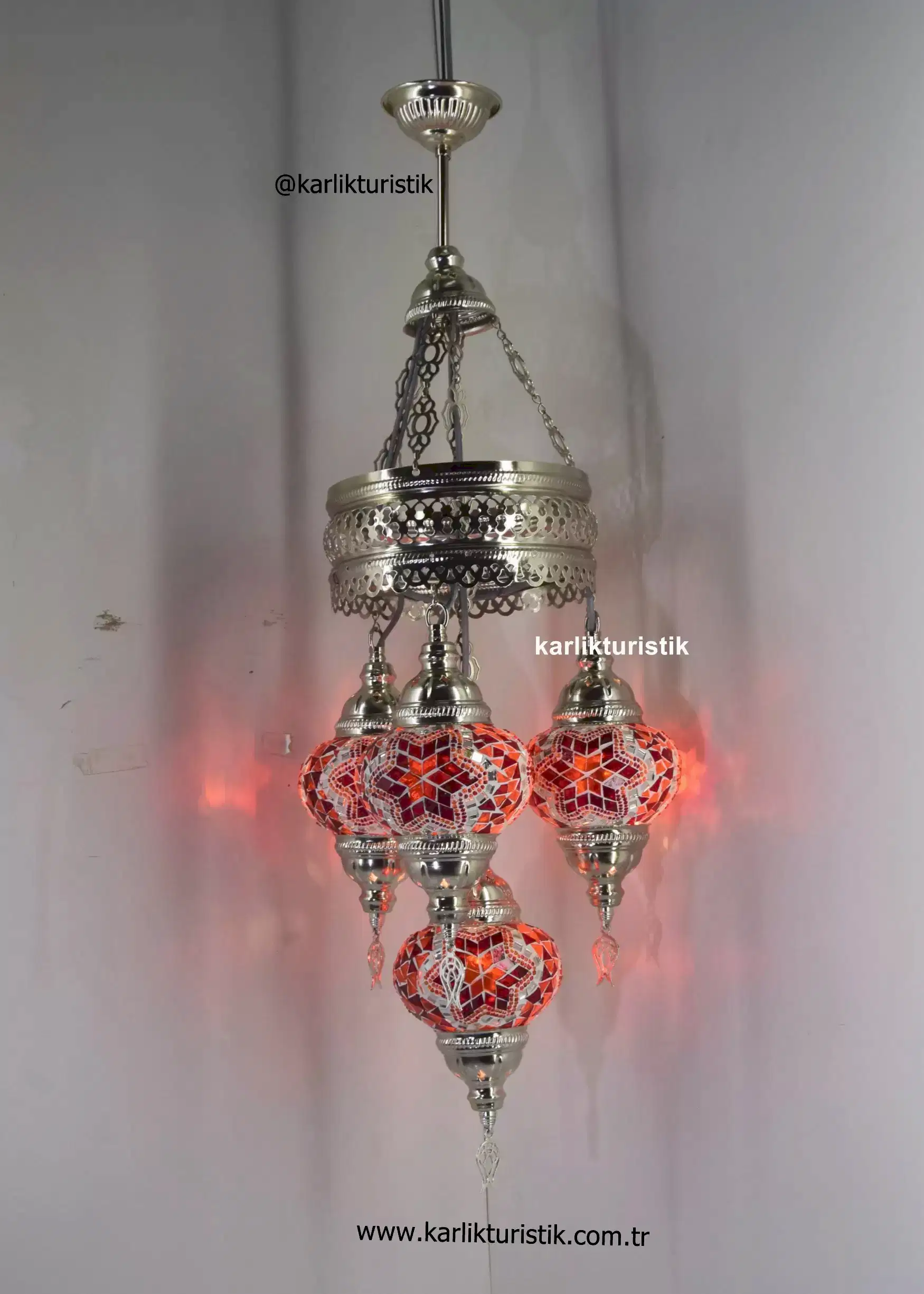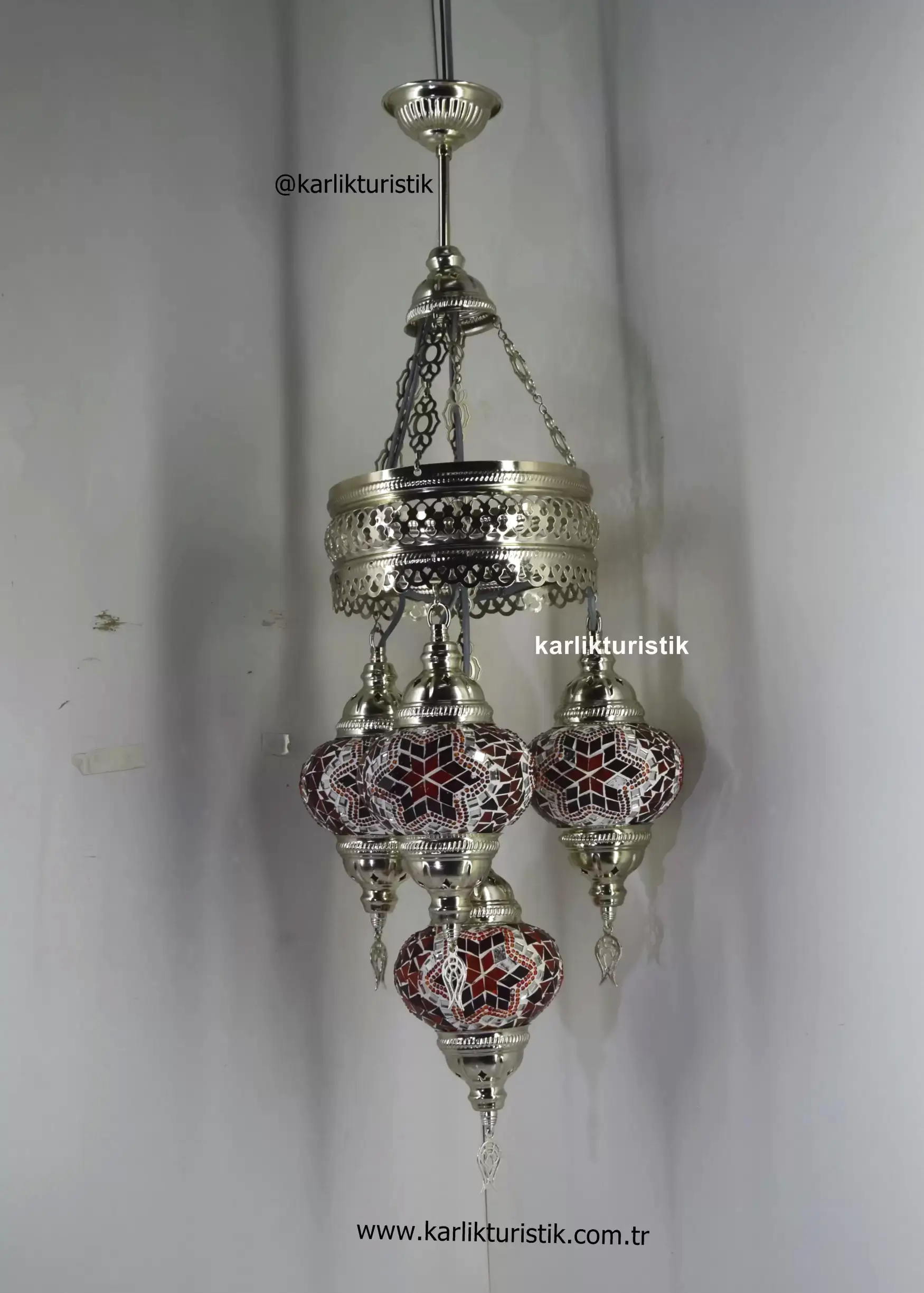 Mozaik Lamba Avize 4lü Gümüş Kaplama Sarkıt Rustik Tavan Lambası Renkli Osmanlı Avize I-S-C 5321