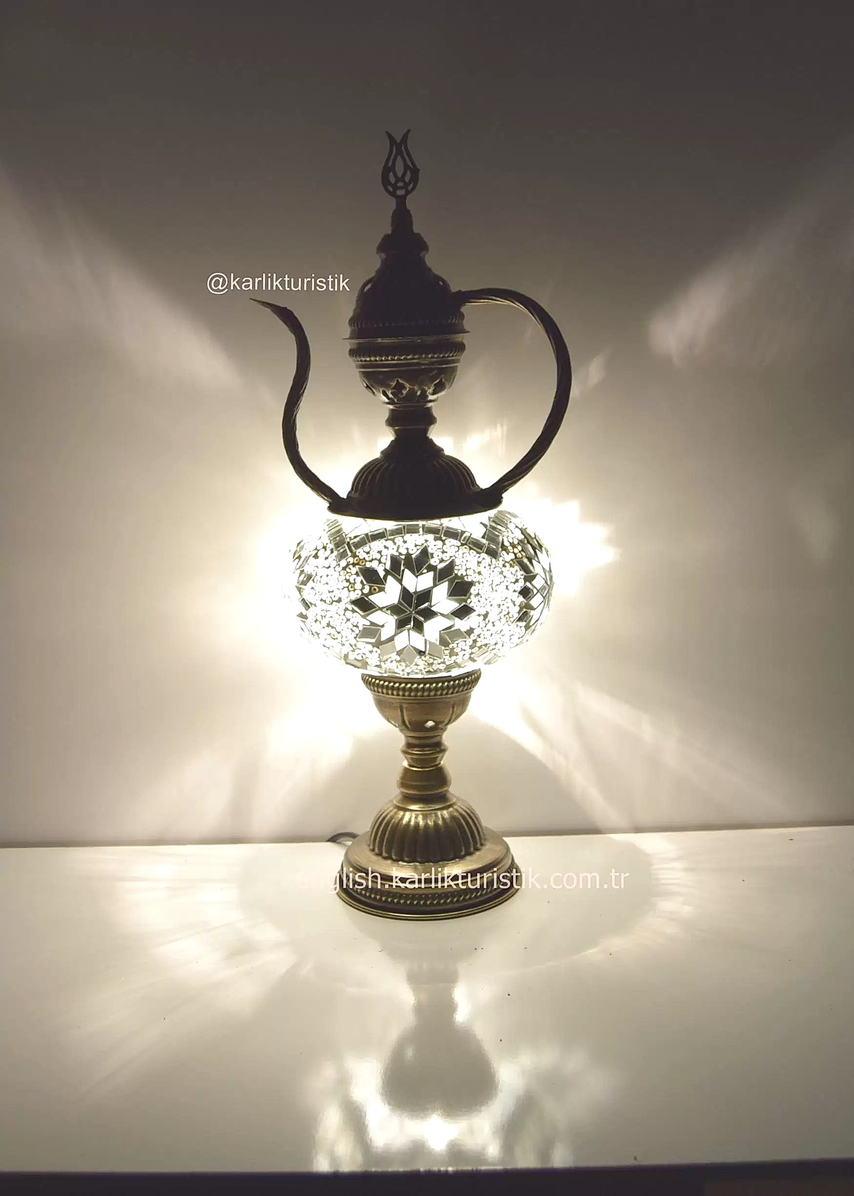 - Mozaik Metal İbrik Şeklinde Demir El İşi Mozaik Masa Lambası Abajur – I-S-T-5017 .Ürünün apratı metal sıvamadan oluşmaktadır.Aparatına ekstra vernik atılarak ,daha uzun ömürlü ve daha parlak olmakdadır. Ürünler yollanmadan tektek denenmektedir. Ürün tamamen türk olmalıdır. Ürün genişliği 20cm olup.Yüksekliği 40cmdir.Kulanılan ayak çapı 13cm dir. camın kısmı orijinal camdır.Bu üründe kullanılan camın çapı 16cm dir.Camlar solma yapmaz. Camlar geleneksel olan alçı kullanılarak yaplmıştır. Alçı kullanıldığı içinde cam parçaları düşmez ve cama sıkıca tutunur. Ürün ce standartlarında olup e14 küçük ampülle kullanılabilir. Kırılmıycak vaziyette tektek paketlemekdeyiz.