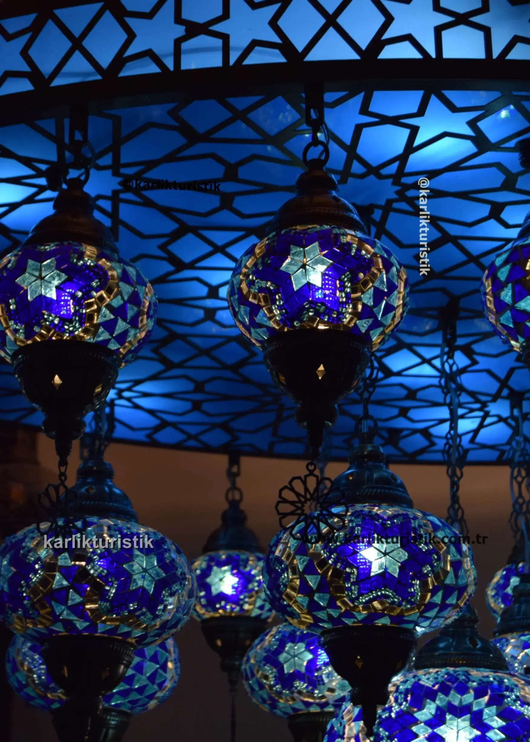 El İşçiliği Mozaik Camlar: Mavi ve turkuazın en canlı tonlarında, tamamen elde hazırlanan 31 adet mozaik lamba ile donatılmıştır.