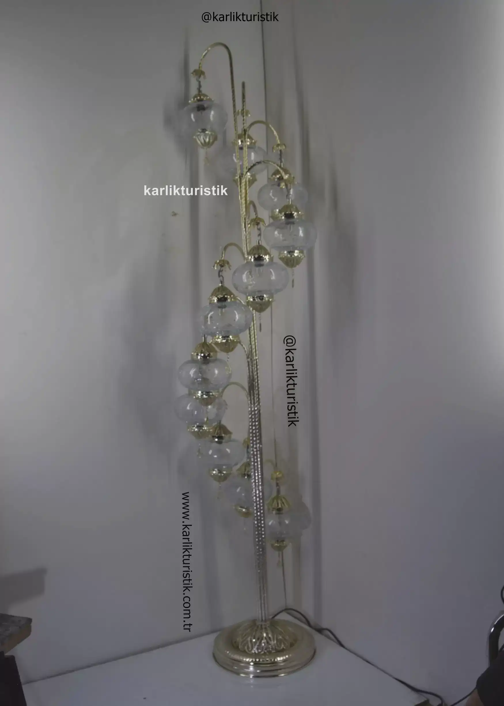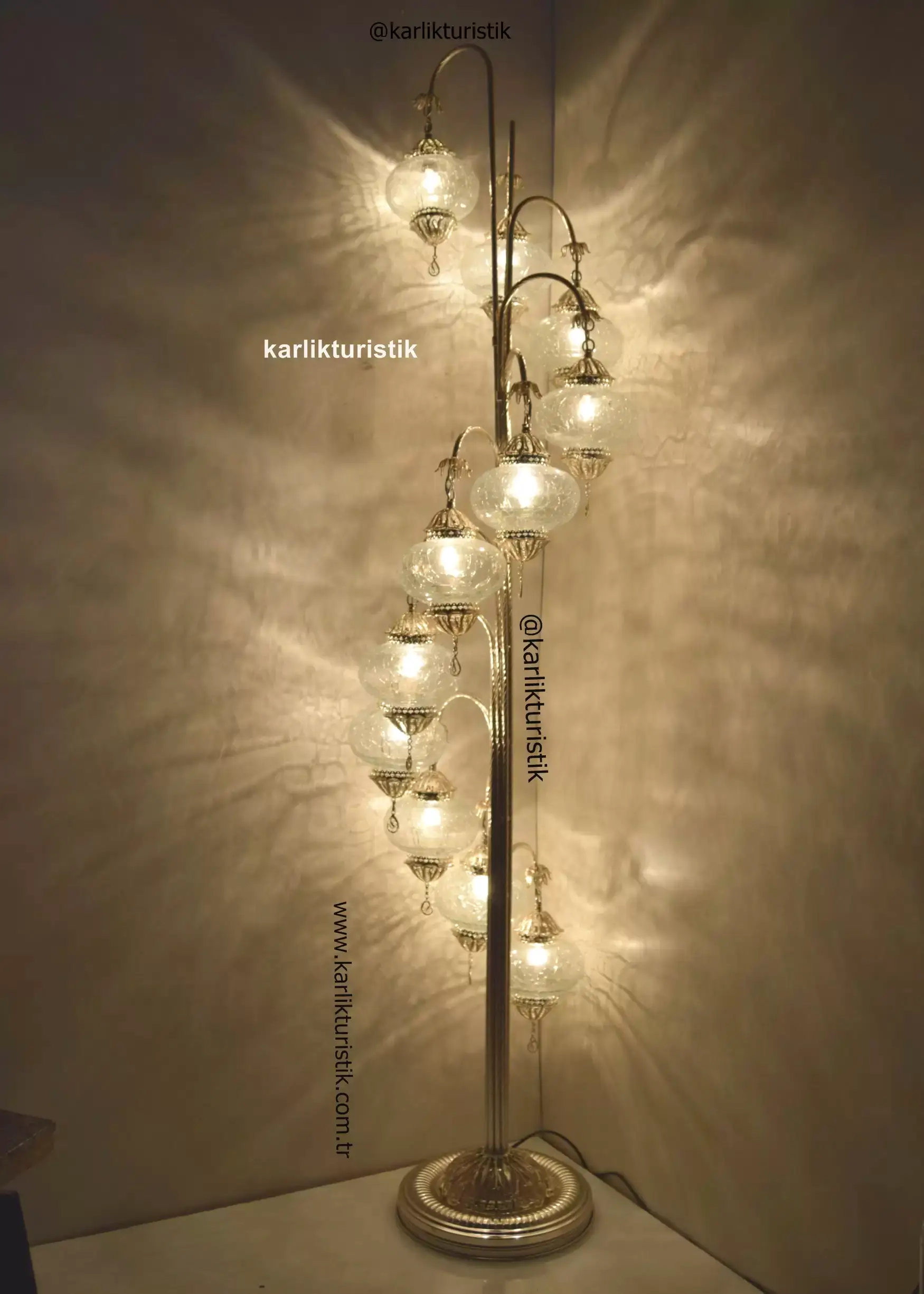 Türk Lambası Ayaklı 11 Küre Bakır Telkari Gümüş Kaplama Osmanlı Kırık Camlı, Türk Lambası Kırık Desenli,Türk Lambası Şeffaf Cam