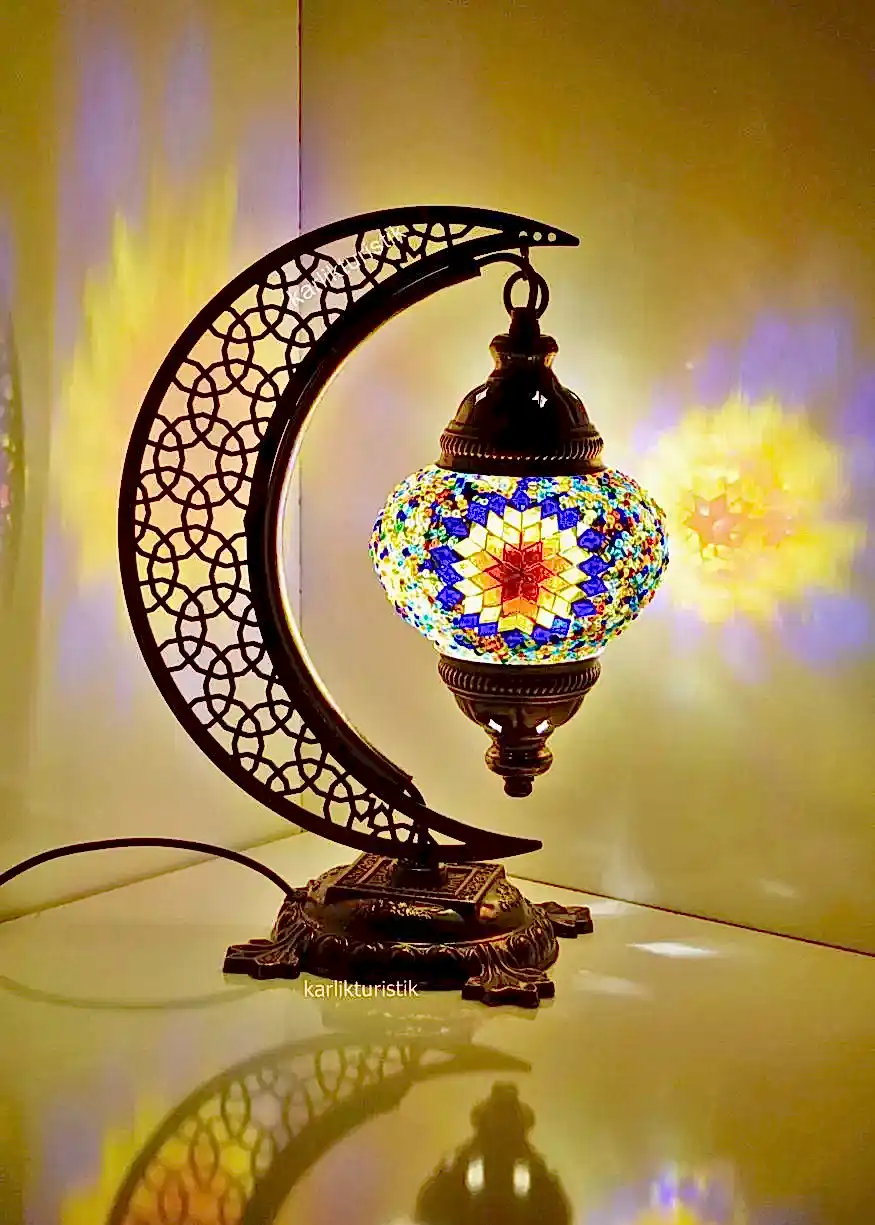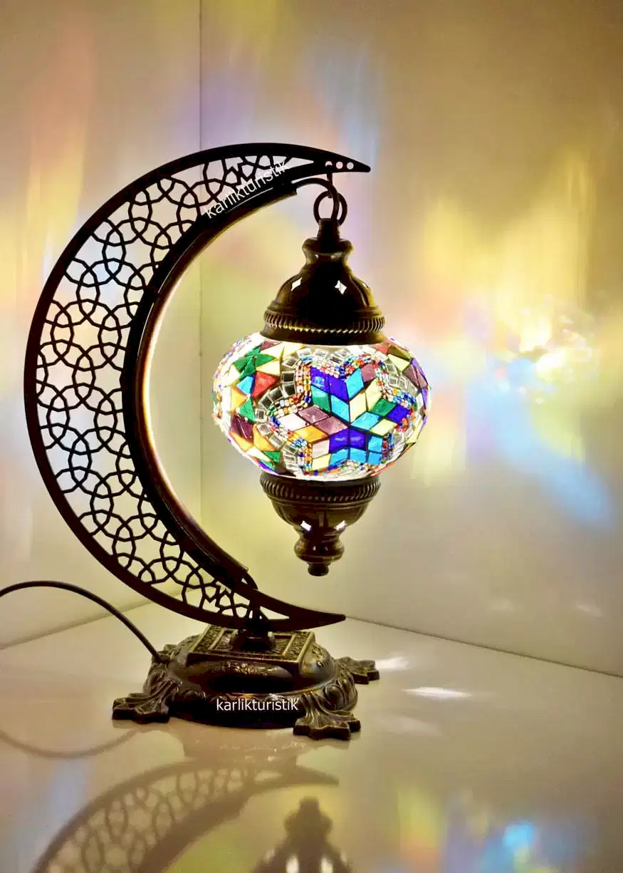 Türk Mozaik Masa Lambası Hilal,Osmanlı Abajur Otantik Lamba, Mozaik Masa Lambası